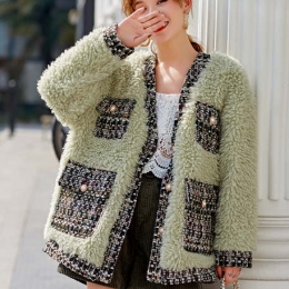 原创复古绿小香风格纹拼接仿羊羔毛外套