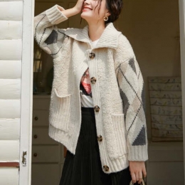 韩版百搭宽松气质拼接格子翻领长袖毛衣