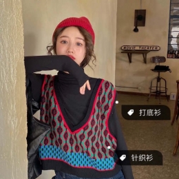 韩国复古V领宽松无袖针织马甲+背心内搭高领t