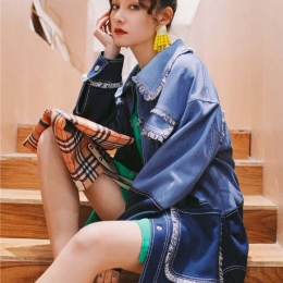 原创复古撞色拼接蓝流苏毛边牛仔服外套