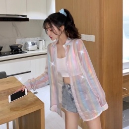 百搭防晒衣女2020新款薄款防晒衫外套夏季宽松镭射人鱼姬长袖衬衫