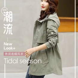 颜色:卡其色、绿色、黑色 风格:简约 服装版型:修身 流行元素:纽扣 领型:连帽 面料/材质:涤纶polyester 衣长/袖长:中长款/长袖