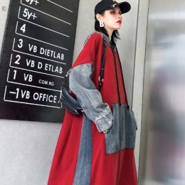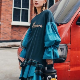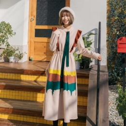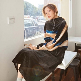 2019新款长袖收腰内搭撞色拼接过膝裙子