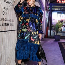 Velvet print stitching ruffled dress
