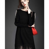 时尚特殊设计珠片翅膀长袖大码流苏连衣裙